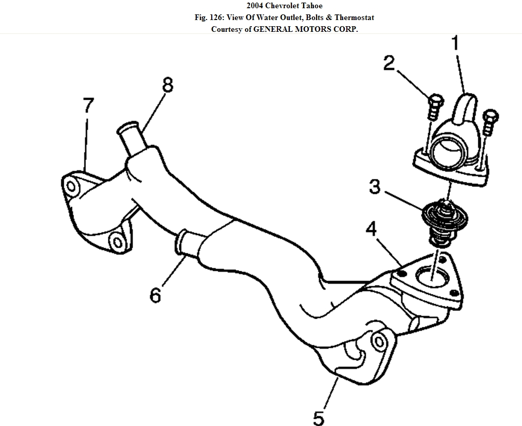 Fig. 126: View Of Water Outlet, Bolts & Thermostat