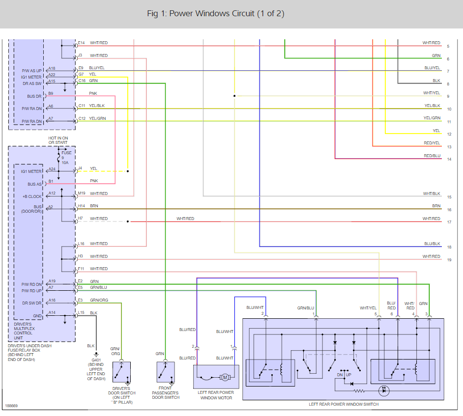 Also it has a fuse under the passenger kick panel and in the engine pdc and both are good. The two main power wires I used to jump the motor up and down go into the door module. Then split off I think into the harness and I guess into the switch but the wires change color. I can unplug the connector at the door module( which is on the door shell. Don't think it can get wet unless door panel and moisture barrier is off) and apply power and ground to my two wires that run to the motor and the window goes up and down. So i think the wires run from inside the car into the switch then into the module then into the motor? I guess. Don't have a wiring diagram at this point.