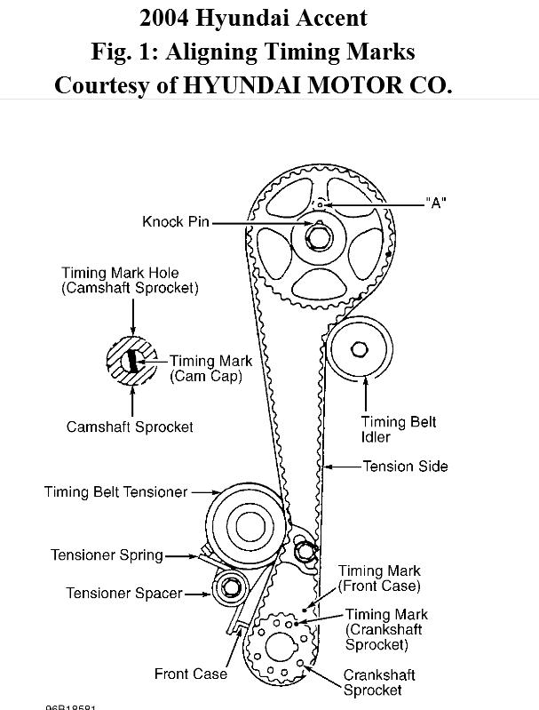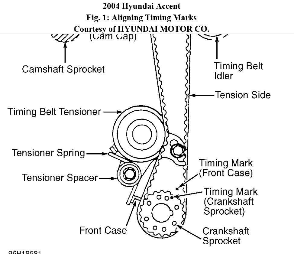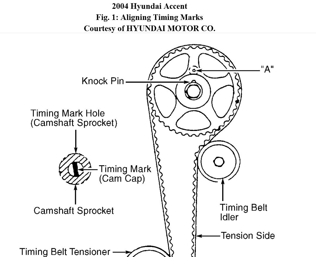 3. Apply counterclockwise force on camshaft sprocket to apply tension on tension side of belt. Ensure all timing marks are aligned. See Fig. 1 .