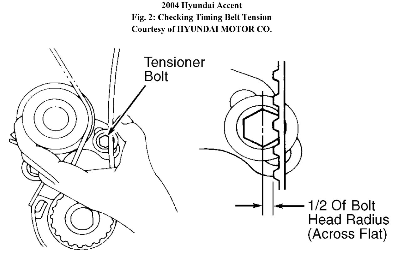 5. Smoothly rotate crankshaft clockwise for 2 full revolutions. Realign crankshaft and camshaft timing marks. To check belt tension, hold belt tensioner and timing belt together and apply slight thumb pressure (about 11 lbs.) at center point of belt tensioner. See Fig. 2 .