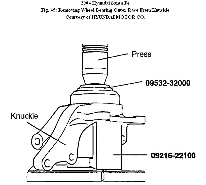 5. Using the special tools (09532-32000, 09216-22100), remove the wheel bearing outer race from the knuckle.