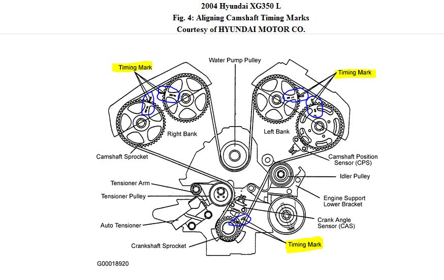 Just replaced the water pump and timing belt but have cocerns over timing marks. I have Hyunida shop manual which reflects the same as your web site for the same vehicle. both mine and your manual show The right bank (Firewall) Left 7.3 pitch/Right 8.7 pitch and the Left bank coincidence. I have tried this shop manual method but cannot turn the crank shaft at all. Or should each sprocket be alined to a timing mark ?????? They were not when I open the covers up.