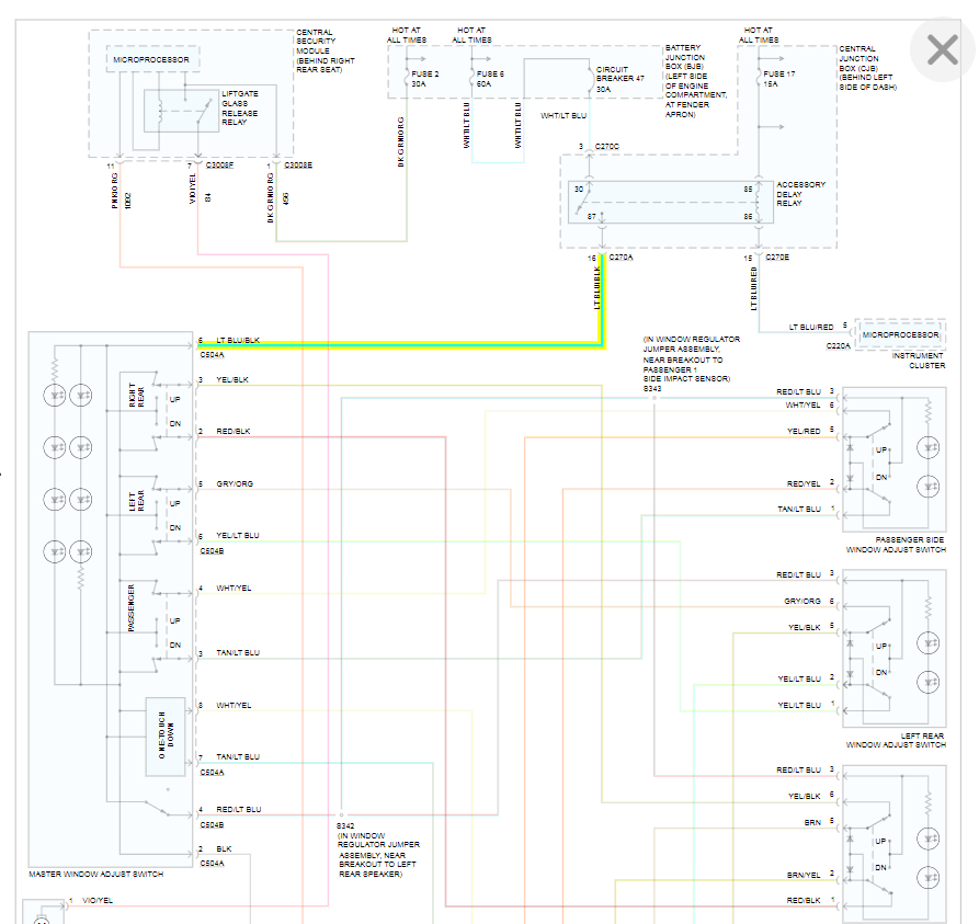 All my windows quit working. replace new master switch on drivers door, replaced fuse under hood has been checked hot and ground wires all working. no power getting to the control switch. Windows still not working had to get fuse from dealer.