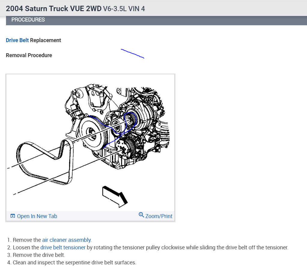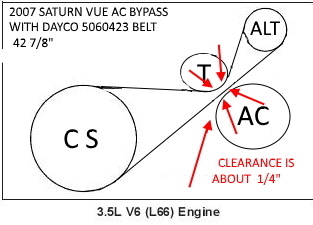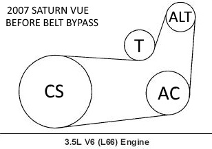 Ok there was a post on here and it is 9 yrs old a member asked if anyone knew if he could bypass his AC clutch pully on a 2004 Saturn Vue because clutch froze up on him and he didn't have $700 (9 yrs. ago price) or if any one knew if he could put a shorter belt on one member put the diagram im posting here of the normal belt diagram w/ac in bottom right alt. top rt. ten. in cntr. and bal. in bottom lft. well the member ended up getting a shorter belt which is DAYCO 5060423 he and another member said it worked! they both said it was so close I guess between the ten. wheel and return going up to alt. that the belt didn't rub at all!! I will post link to this question and answers so members can see what I mean. I have the same problem but I have a 2007 Saturn vue and my question is does any member have a pic or a diagram of what it looks like when this belt bypass is installed?? thank you to all my fellow members in advance!!