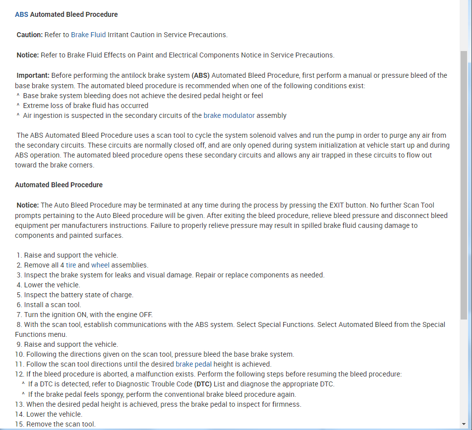 The ABS Automated Bleed Procedure uses a scan tool to cycle the system solenoid valves and run the pump in order to purge any air from the secondary circuits. These circuits are normally closed off, and are only opened during system initialization at vehicle start up and during ABS operation. The automated bleed procedure opens these secondary circuits and allows any air trapped in these circuits to flow out toward the brake corners.