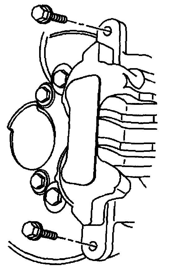 Notice: Support the brake caliper with heavy mechanic's wire, or equivalent, whenever it is separated from it's mount and the hydraulic flexible brake hose is still connected. Failure to support the caliper in this manner will cause the flexible brake hose to bear the weight of the caliper, which may cause damage to the brake hose and in turn may cause a brake fluid leak.