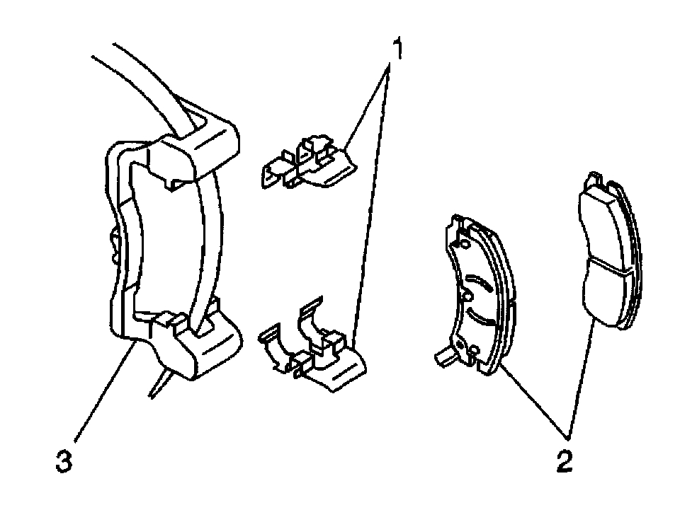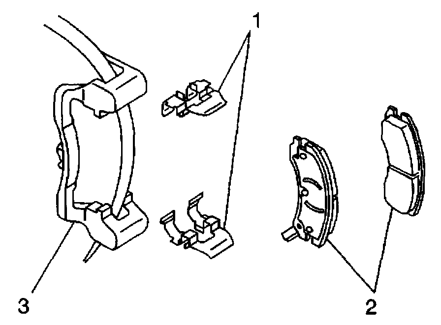 4. Remove the brake pad retainers (1) from the brake caliper bracket (3).