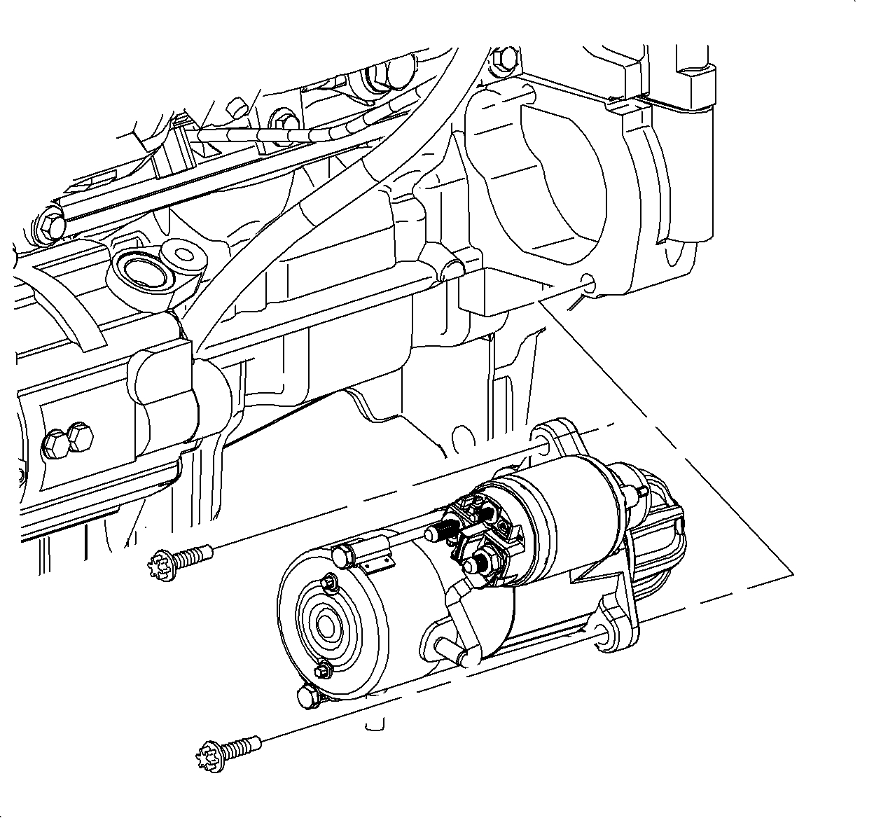 7. Move the starter right, clearing the engine block, then left and out of the engine block (flywheel housing).