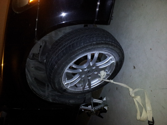 Up to now, everything I've mentioned assumes the top of the wheel is moved out, but remember, it was the bottom of the wheel that was forced IN during the impact. To bend the strut, the wheel had to act as a lever pivoting on the ball joint stud to bend something out on top. That much force could have pushed the control arm mounts in. To find that, measure the distance between the lip of the wheel to the strut body, (purple double arrow), and compare that to the other side. If that distance is greater on the right side, the strut is bent or shifted, or the knuckle is bent. If you find that measurement is the same on both sides, that area is okay and the bottom of the wheel has to have been pushed in. In that case, compare the lower control arm mounts on both sides of the car. Two bolts go through those mounts and rubber bushings that the control arm pivots on. The mounts are just to the right of the yellow arrow. There's a front one and a rear one on each side. Together with the lower ball joint, that arm is a big triangle.