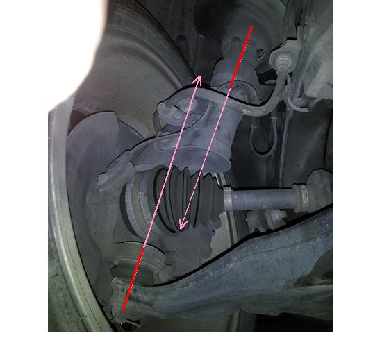 In the second photo, notice that the centerline of the ball joint and the centerline of the strut are not in line. Compare that to the other side of the car. That could be an optical illusion from the camera angle, it could be designed in to cause a camber change when cornering, or it could be a clue to finding bent parts.