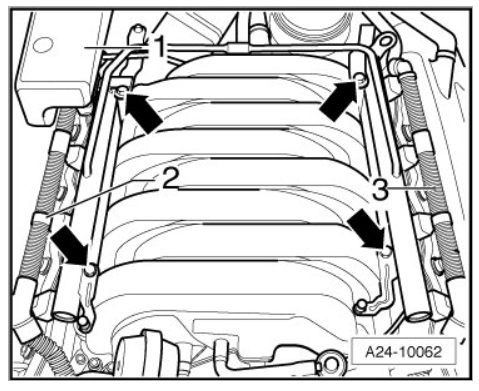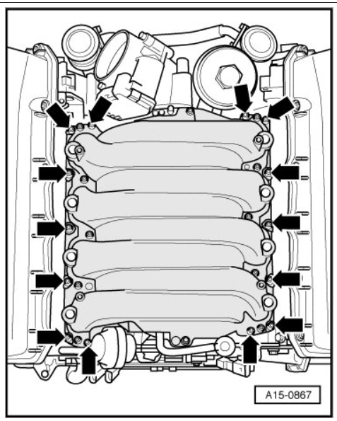 Remove the intake manifold bolts - arrows - and remove manifold.