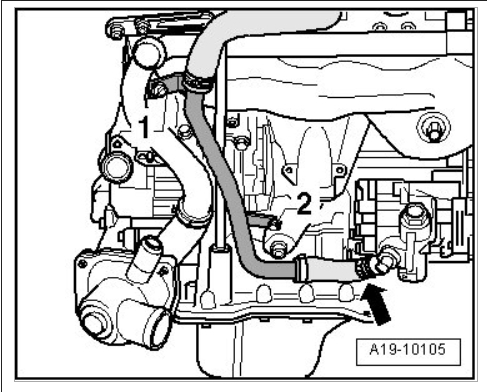 Loosen hose clamps - arrows - and remove right coolant pipe from coolant hoses.