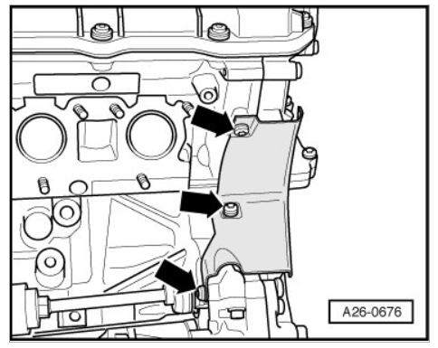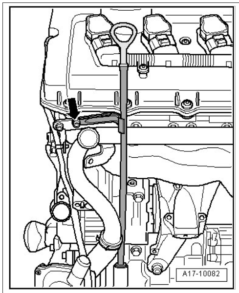 Remove guide pipe for oil dipstick at cylinder head - arrow -, pull up and remove.