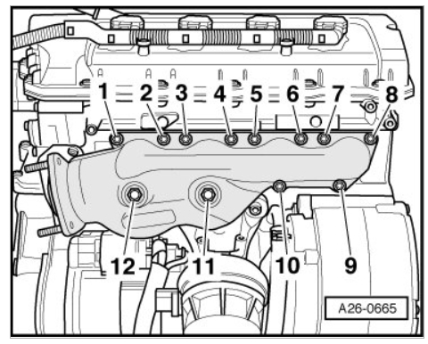 Remove nuts - 1 through 12 - and remove right exhaust manifold.