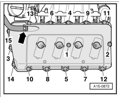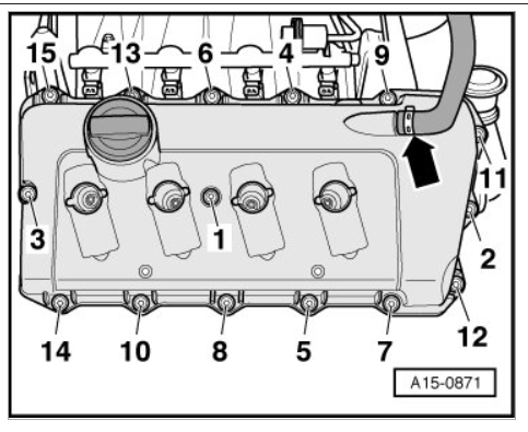 Remove left cylinder head cover bolts in sequence - 15 to 1 -.