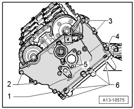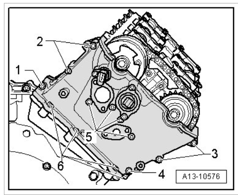 Remove the bolts - 1 through 6 - and the left timing chain guard.