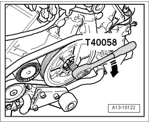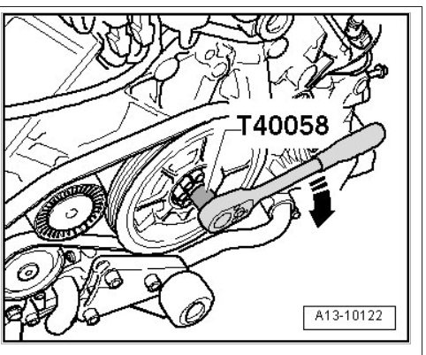 Using (T40058) turn the crankshaft two complete rotations in direction of engine rotation - arrow - until crankshaft stands at TDC again.