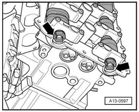 Tighten camshaft bolt - 1 - on exhaust camshaft of the left cylinder head to initial tightening specifications. Tightening specifications: 40 Nm.
