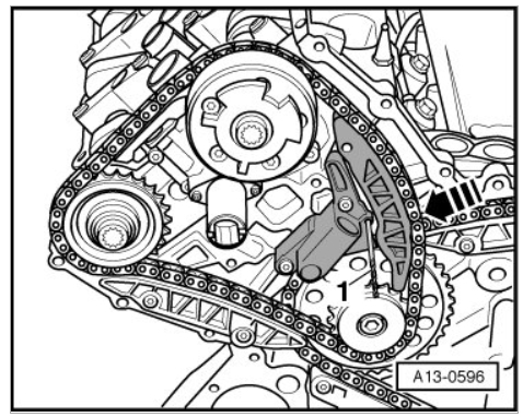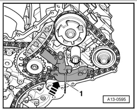 Push chain tensioner glide track for left timing chain in direction of - arrow - and pull off chain tensioner using a 3.3 mm drill bit - 1 -.