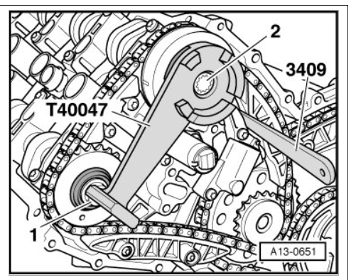Remove bolts - 1 and 2 - for the camshaft chain sprocket or camshaft adjuster using (T10035).