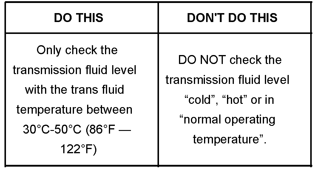 ^ The transmission fluid temperature MUST be between 30°C - 50°C (86°F - 122°F) when checking the fluid level. Checking the fluid level with fluid temperatures out of range may lead to a incorrect fluid level causing additional customer concerns.