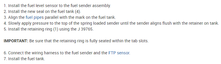 I've attached picture steps below on how to replace the in-tank fuel pump and removal and replacement of the fuel tank on your car. Hope this helps and thanks for using 2CarPros.