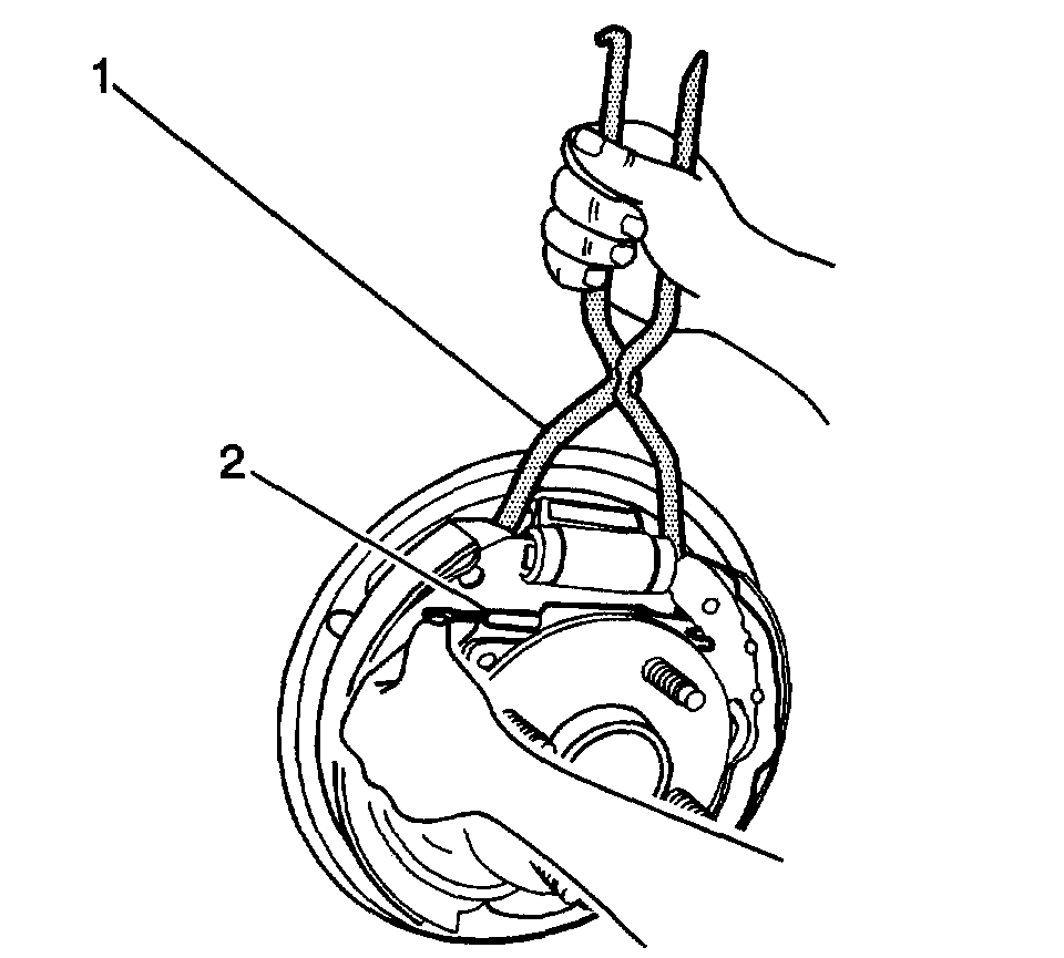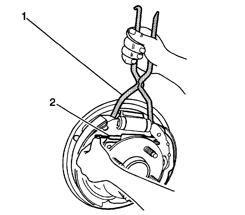 5. Using the J 38400 (1), spread the top of the brake shoes apart and install the adjuster assembly (2) to the brake shoes.