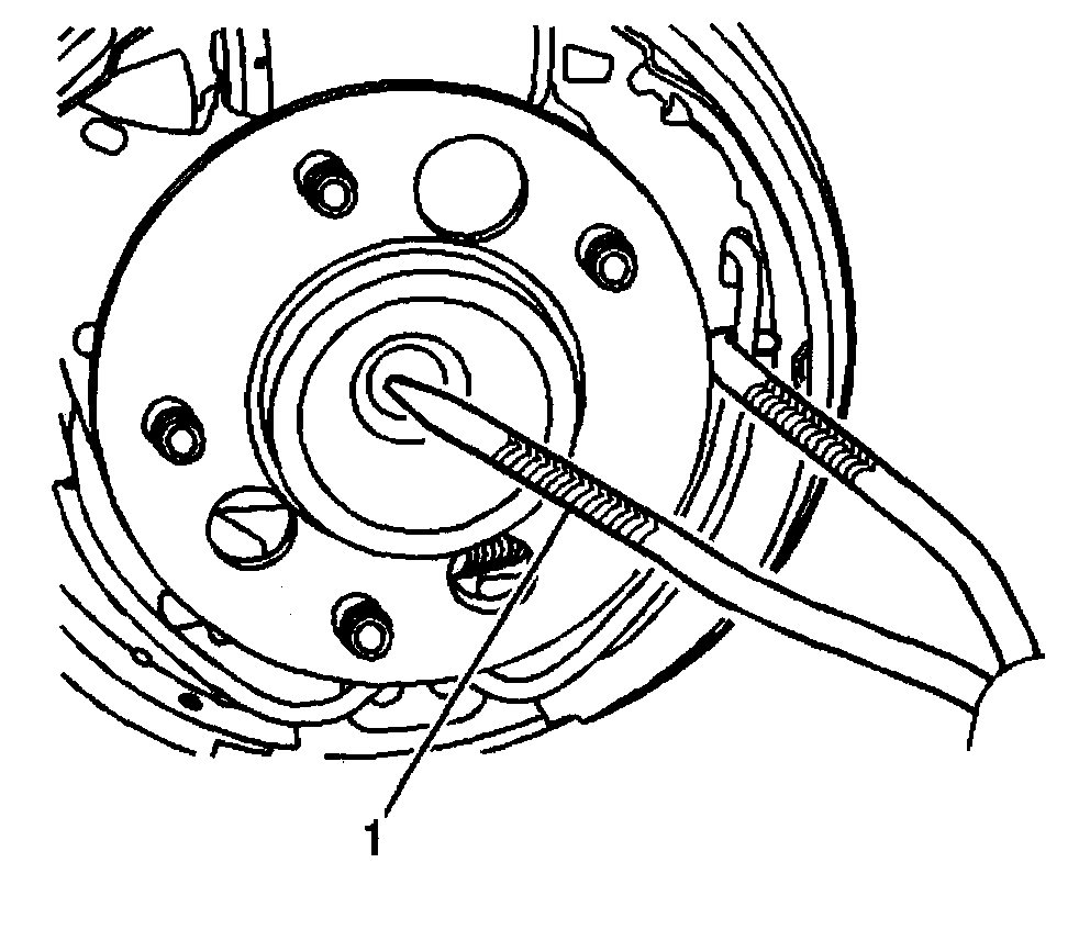 2. Position the hook end of the J 38400 (1) under the universal spring and lightly pull the universal spring end out while installing the primary brake shoe. Ensure that the universal spring engages the brake shoe web hole.