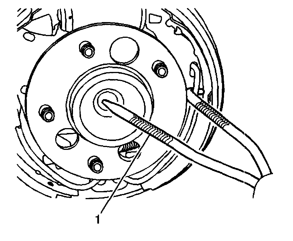 7. Position the hook end of the J 38400 (1) under the universal spring and lightly pull the universal spring end out of the shoe web hole. Hold the universal spring with the tool while removing the secondary brake shoe.