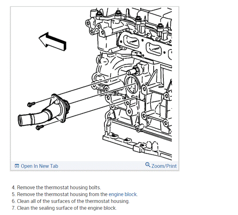 REMOVAL: Remove the necessary coolant from the radiator. Remove the alternator. Loosen the outlet hose clamp at the thermostat housing. Remove the outlet hose from the thermostat housing. Remove the thermostat housing bolts. Remove the thermostat housing from the engine block. Clean all of the surfaces of the thermostat housing. Clean the sealing surface of the engine block.