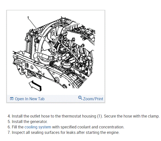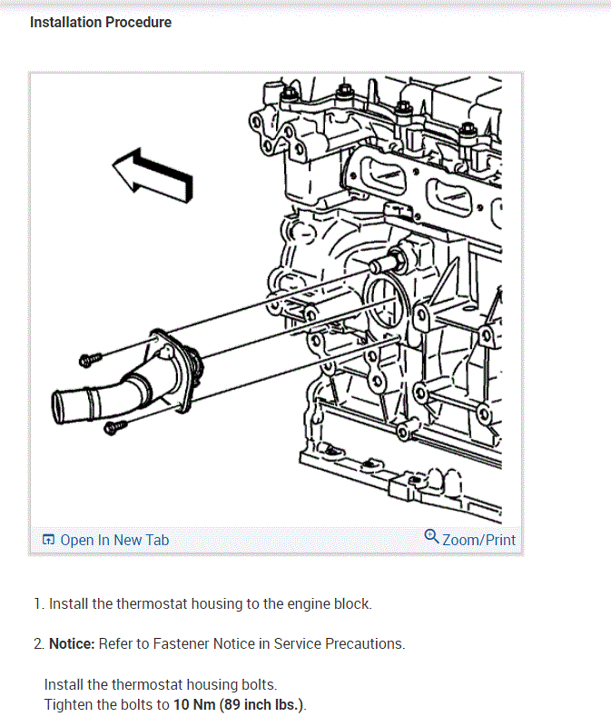 INSTALLATION: Install the thermostat housing to the engine block. Install the thermostat housing bolts and tighten to 89 inch lbs. (10 Nm). Lubricate the inner diameter of the radiator hose with engine coolant. Install the outlet hose to the thermostat housing. Secure the hose with the clamp. Install the alternator. Fill the cooling system with specified coolant and concentration. Inspect all sealing surfaces for leaks after starting the engine. Thanks for using 2CarPros.com!