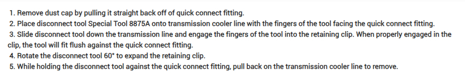 I attached information related to removing the quick connectors. They can be a bit of a pain if you don't have the right tools. The tool indicated is Chrysler part 8875A which is a small removal tool with a large price tag. See pic one.