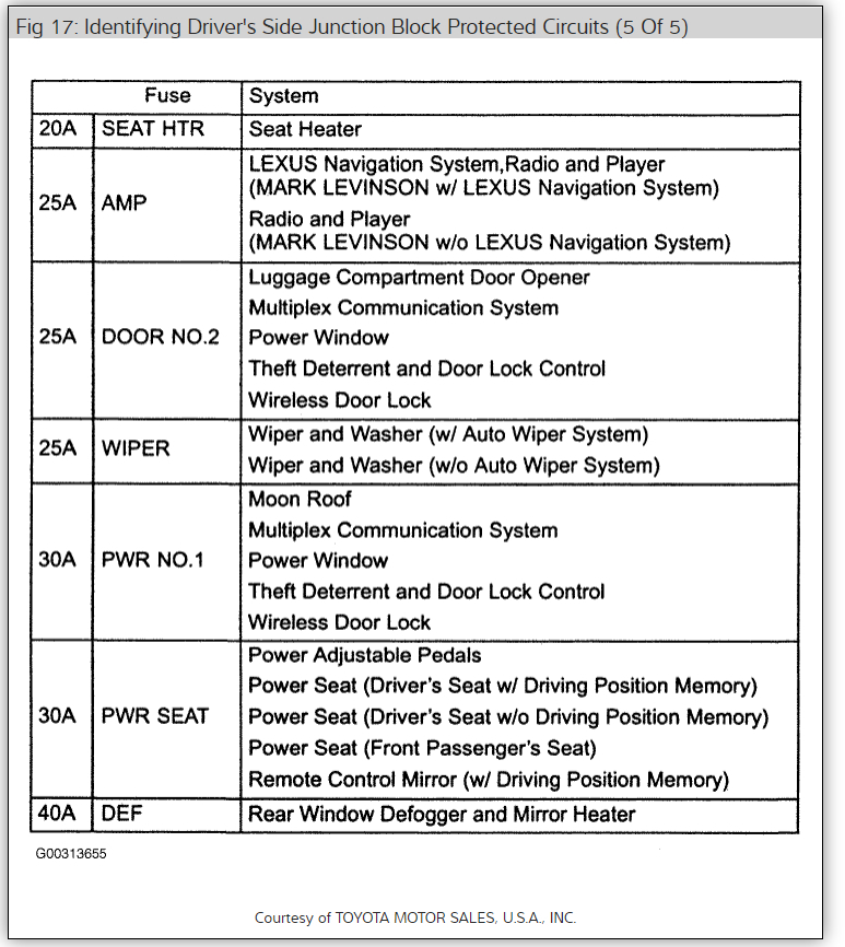 Trunk release button does not work. I can open trunk with hand remote. Cannot find a fuse for this feature. The button next to it is gas door release and that works. Both seem to be on same circuit. I checked that 5 amp fuse and it was OK. Is there another fuse for the trunk release" If no, what can cause this problem?