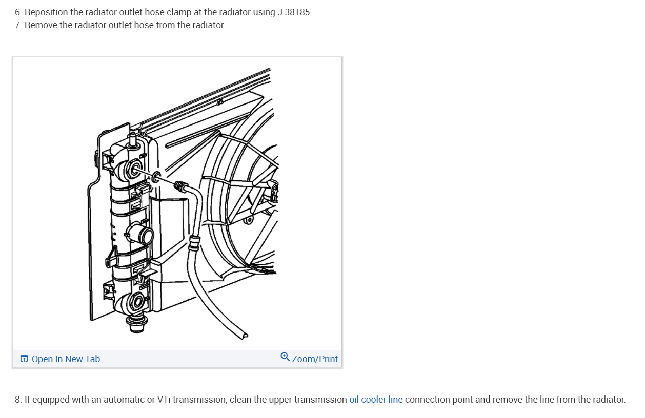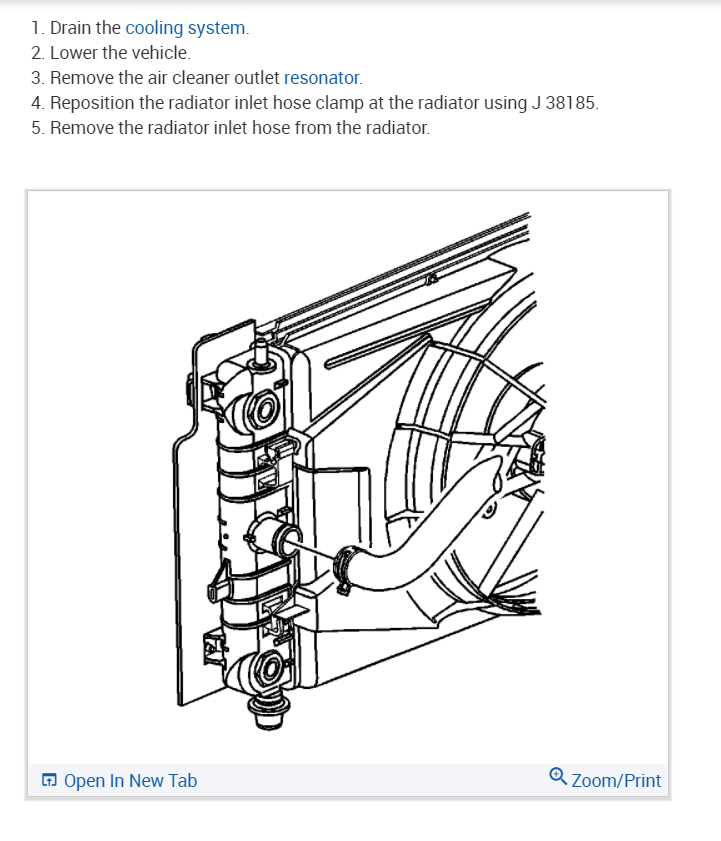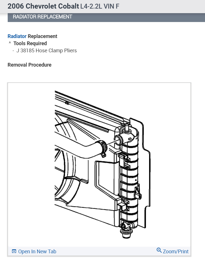 Replacing radiator is a long process. Below are instructions as best as can be for replacing your radiator. If you need an image or help with a certain step, just let me know. The special tool used ( J 38185) are called hose clamp pliers. Purchasing this tool will make replacement of radiator much easier.
