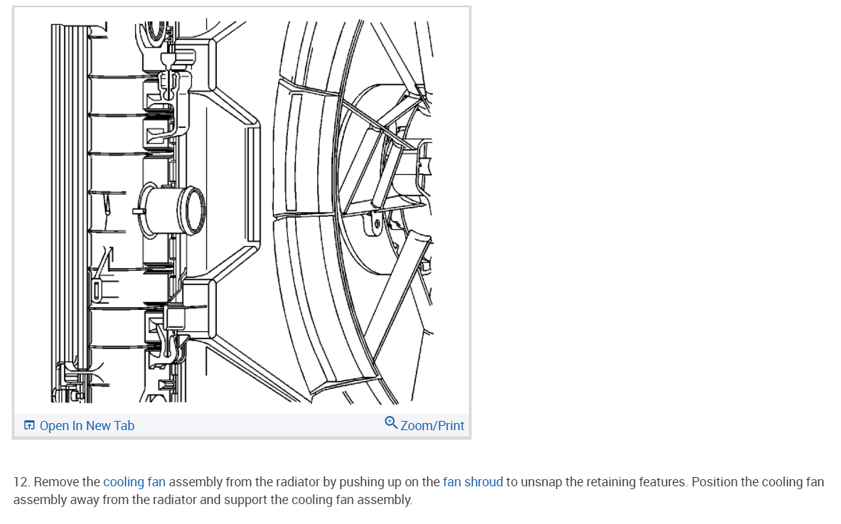 Remove cooling fan assembly from radiator by pushing up on fan shroud to unsnap retaining features. Position cooling fan assembly away from radiator and support the cooling fan assembly.