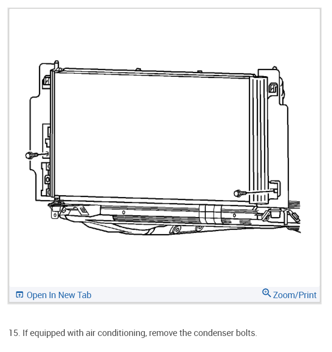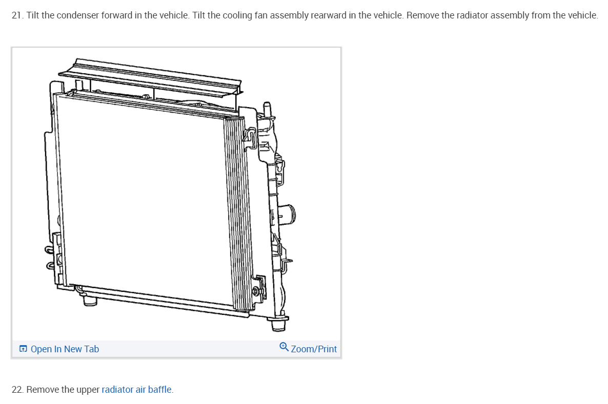 Tilt condenser forward in the vehicle. Tilt cooling fan assembly rearward in the vehicle. Remove the radiator assembly from vehicle.