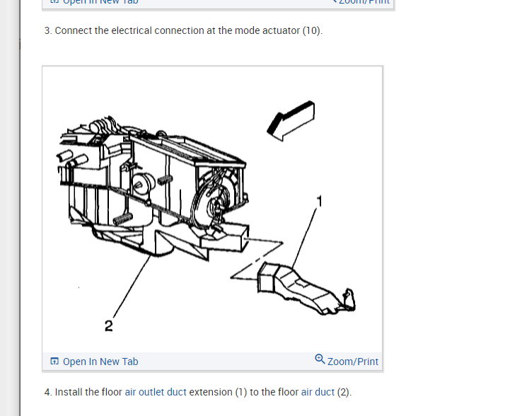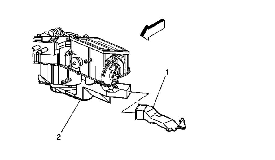 1. Remove the floor air outlet duct extension (1) from the floor duct (2).