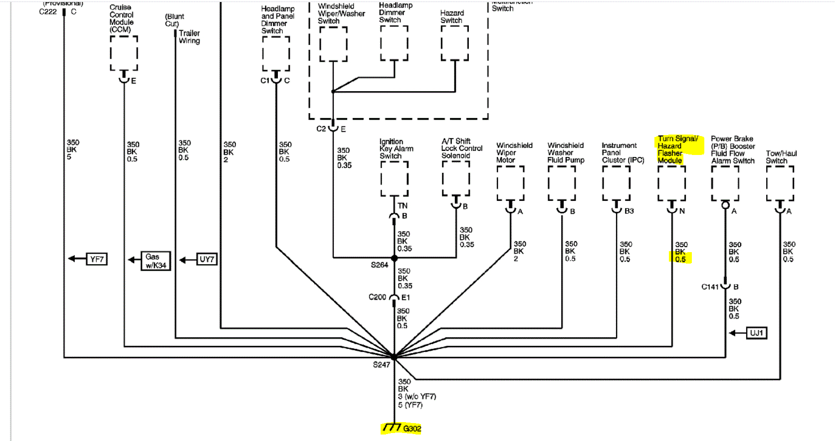 Here is how this system works. The ign e 10 A fuse in the underhood fuse block supplies battery positive voltage to the turn signal switch assembly. Ground for the hazard switch is from G302. The flasher 15 A fuse in the underhood fuse block supplies battery positive voltage to the turn/hazard flasher module. When the turn signal switch is placed in either the left or right position, a voltage signal is completed from the turn signal switch to the turn/hazard flasher module. When the hazard flasher switch is activated, a ground signal is completed from the hazard switch to the turn/hazard flasher module. The turn/hazard flasher module then sends an on-off voltage signal to the appropriate turn signal lamps, or to all turn signal lamps for hazard operation through fuses.