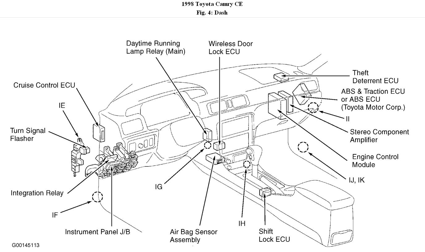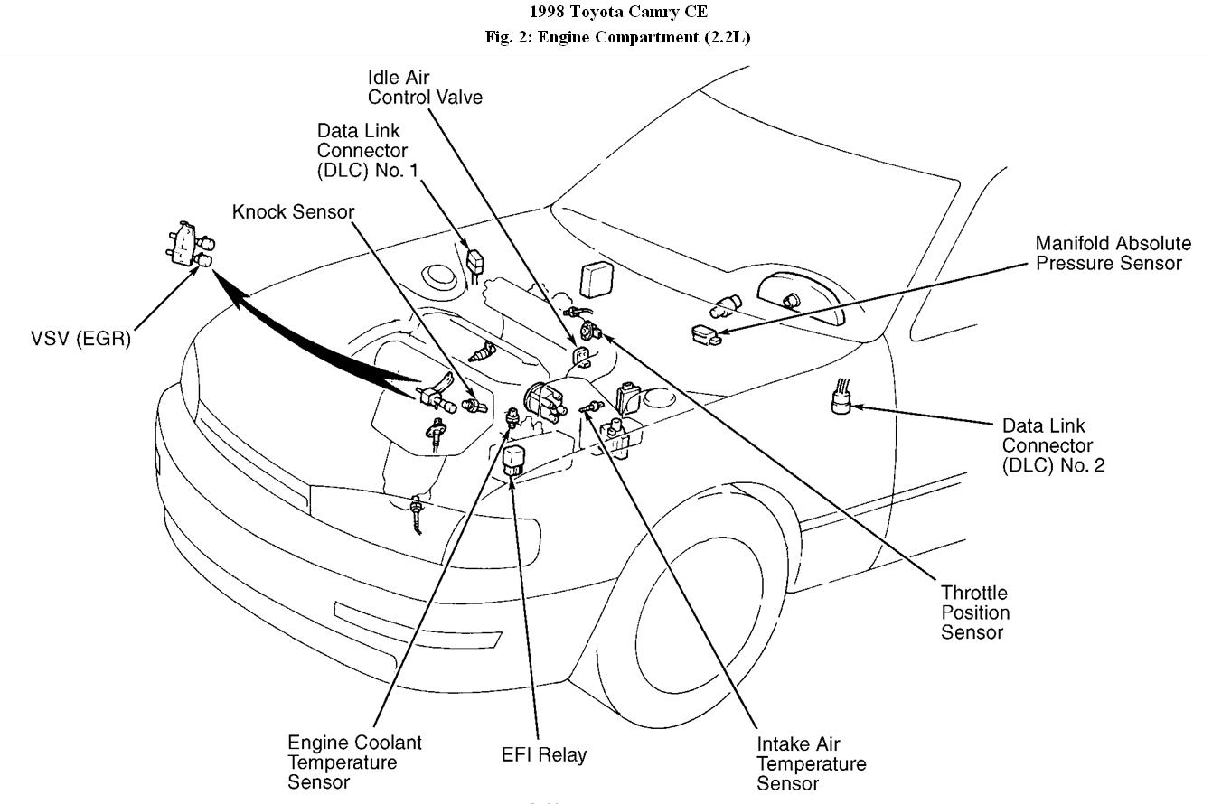 Thanks a lot,Concernig the 98 camry,please can you just give me the diagram of the engine and label things like the MAP sensor,absolute manifold pressure,glove box,ECM so thati will know there location.Again are you saying that the brain box may be faulty or just tell me the part that has the problem so that i can change it bcos i don't have the necessary tools or expertise to test things except it is more detailed which i dont want to border you with but i will be happy if i just know the part to change or repair if possible
