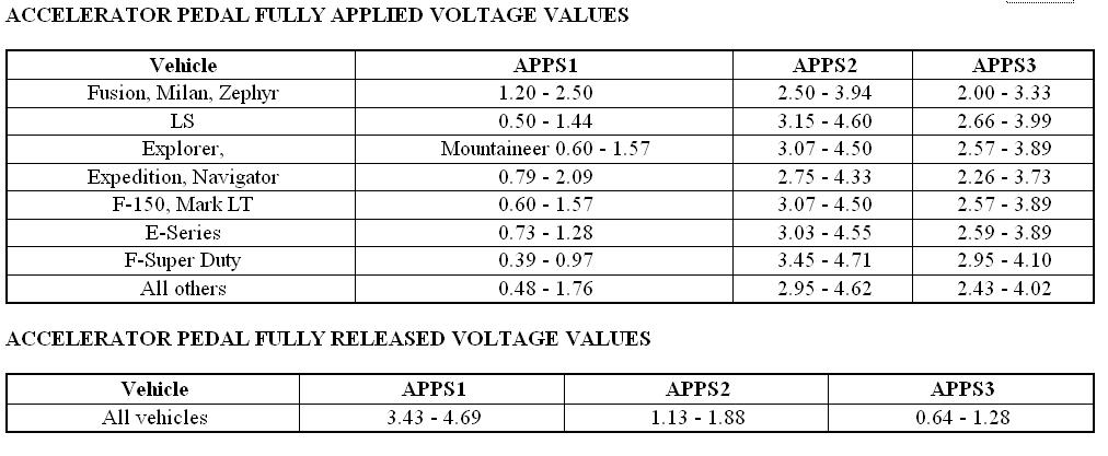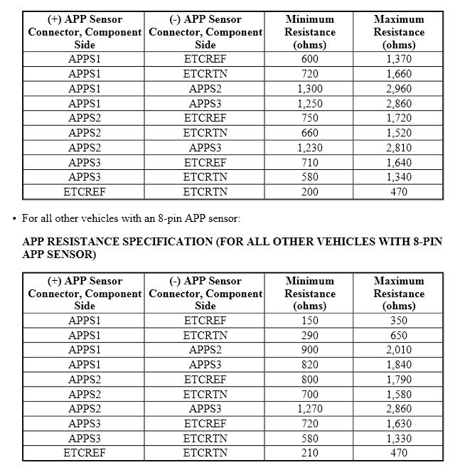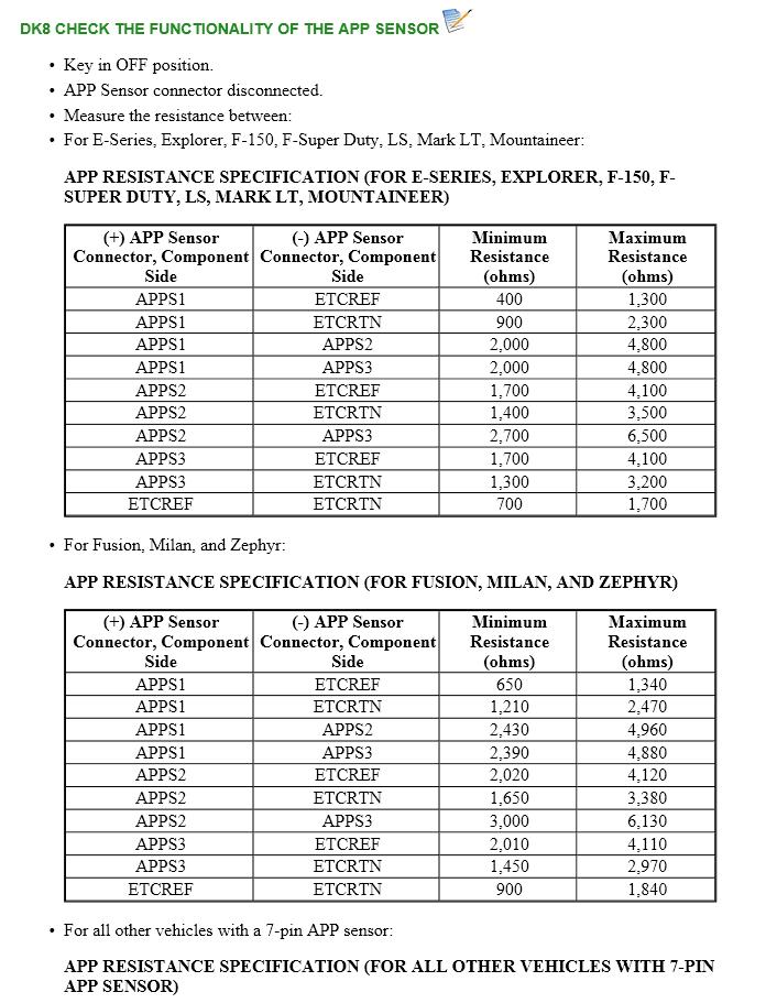 Is the resistance between 700 ohms - 1,700 ohms (E-Series, Explorer, F-150, F-Super Duty, LS, Mark LT, Mountaineer), 900 ohms - 1,840 ohms (Fusion, Milan, Zephyr), 200 ohms - 470 ohms (all other vehicles with a 7-pin APP sensor), or 210 ohms - 470 ohms (all other vehicles with an 8-pin APP sensor)?