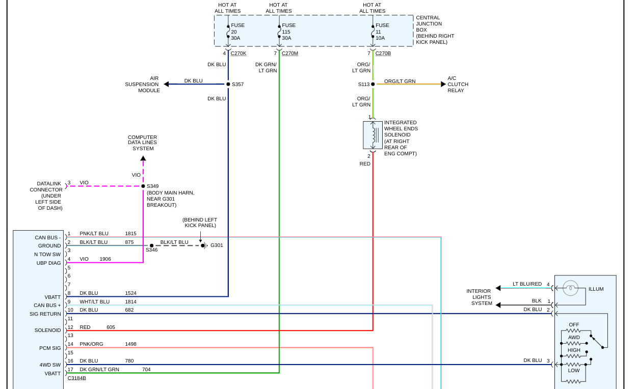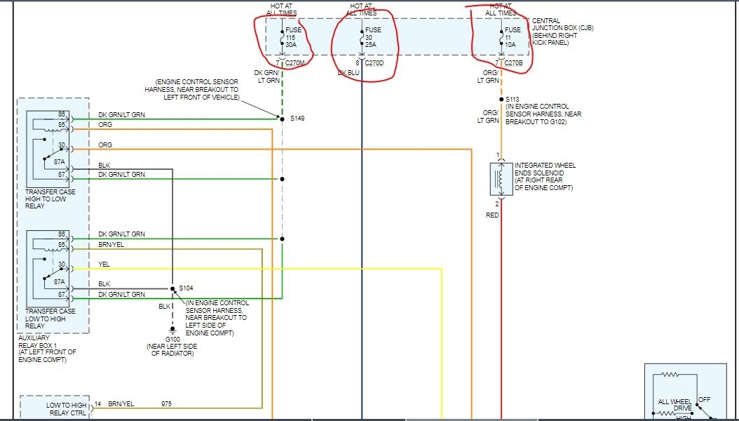 You need to test for power to the motor on the transfer case to be sure it has power when you command 2 and 4 wheel drive. Check the fuses I circled for power on both sides to be sure available power is available.