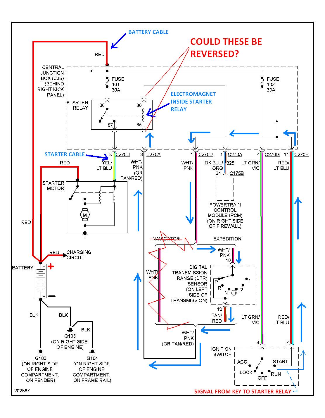 I SHOW THE PATH OF THE KEY SIGNAL TO THE STARTER RELAY-----REALLY, THE PROBLEM MOST LIKELY IS BETWEEN THE KEY AND THE STARTER RELAY