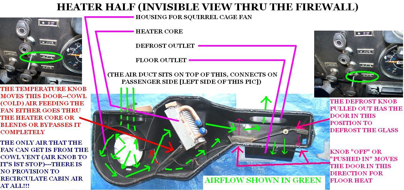 IN PIC 1) THE LEFT SIDE OF THE DOOR SWINGS UP OR DOWN. "DOWN" TO RUN AIR THRU THE HEATER CORE (WHICH IS ALWAYS HOT ON A CJ) OR "UP" WHICH BYPASSES THE HOT CORE, AND ALLOWS OUTSIDE AIR TO BLOW THRU THE SYSTEM.