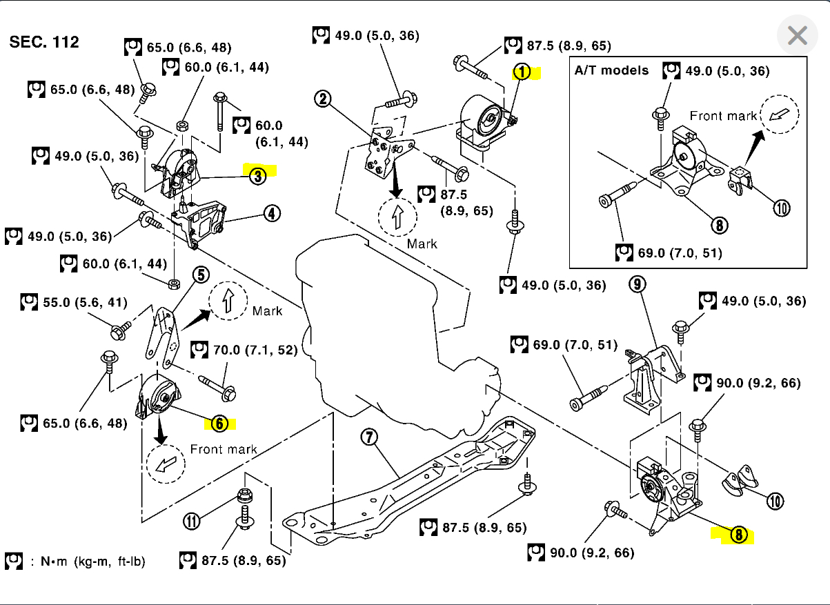 I have attached the diagrams showing the engine mount locations as well as the torque specifications.