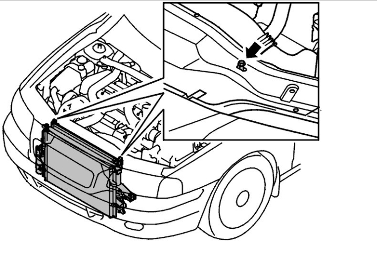 Block the lower hose coolant hose with lock grip pliers. Apply a hose on the nipple at the radiator. Feed the hose down to a container. Open the nipple and drain off the coolant. Disconnect the connector from the receiver drier and the cable from the holder. Hang up the condenser using tie straps on the right hand side in the pipe for the receiver drier and on the left hand side in the pipe for the condenser. Remove the lower screws holding the radiator unit.