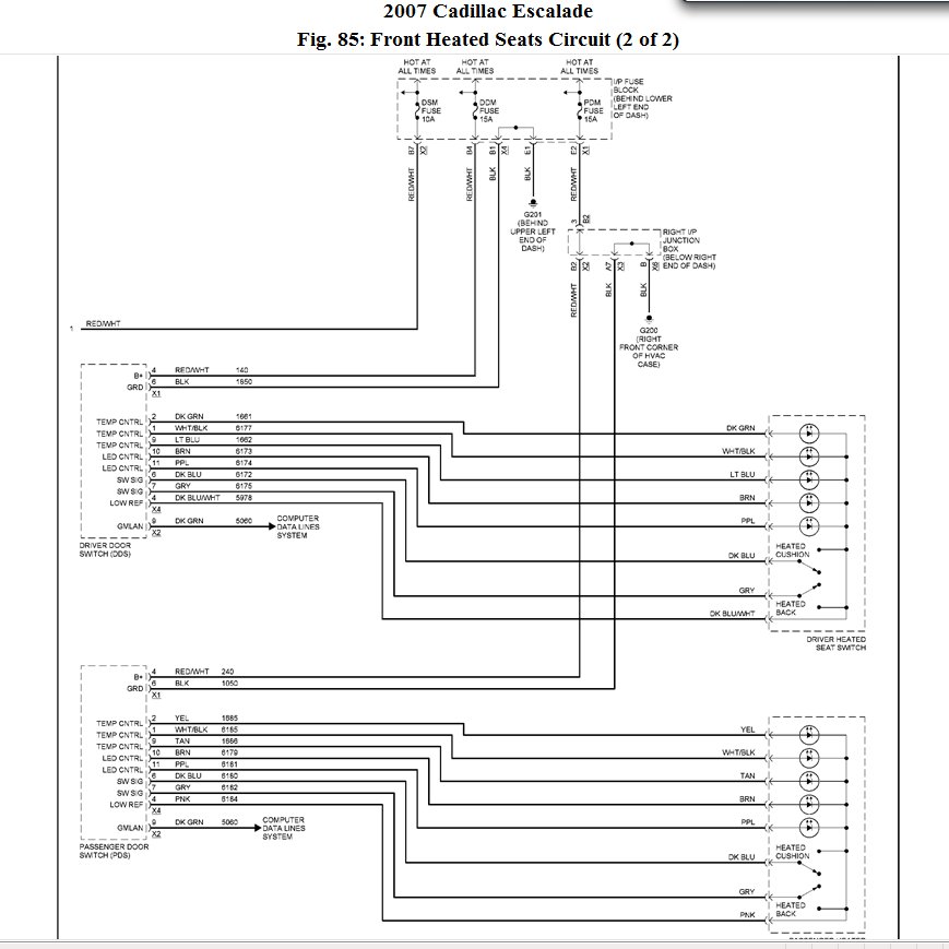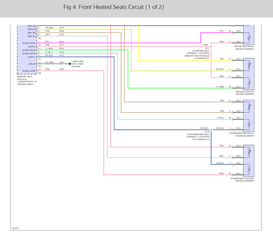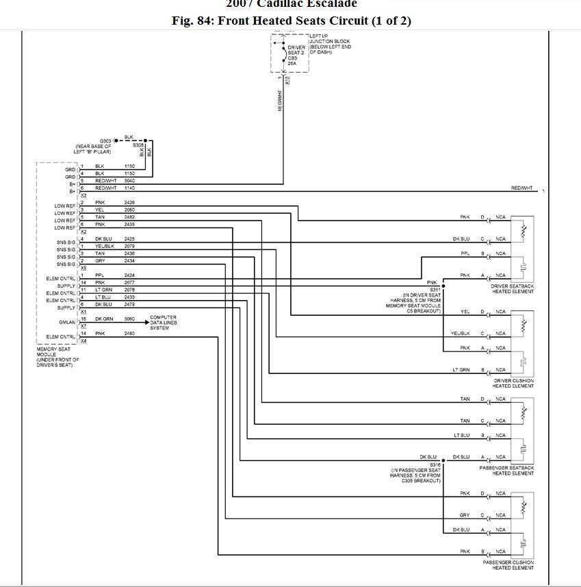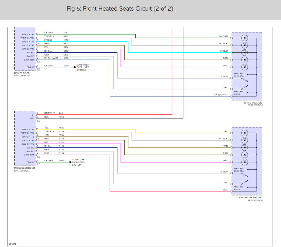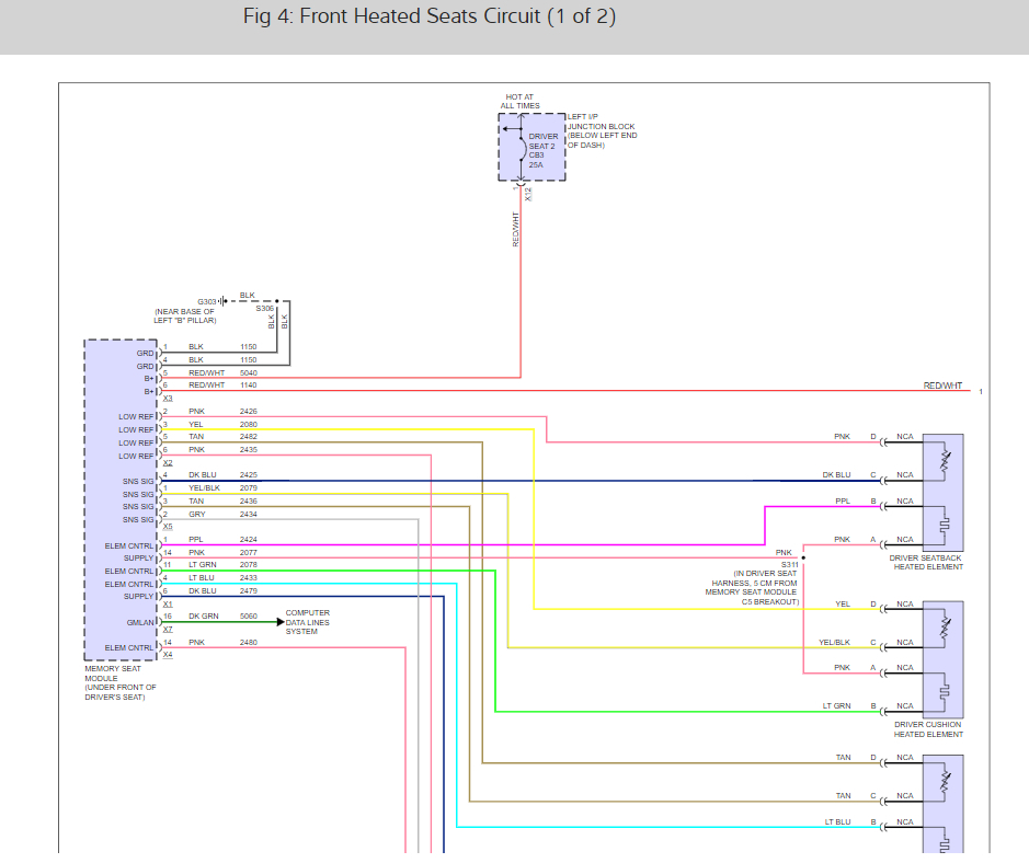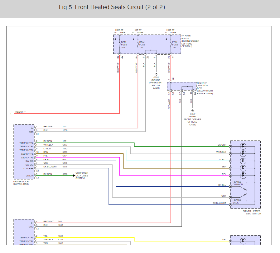 I am providing you with the wiring diagrams for the seat heater circuits. They are 2 pages labeled 1of2 and 2of2. The #1 diagram will be to the left of the #2 diagram to make a complete picture. There is a red and white wire, I believe it is red and white but I have it closed not, and you can see where the wire goes off the page to the right in diagram #1 and comes into the left side of page in diagram #2. It looks like the diagrams are cut off bottom and top but I do this to make the image as large as possible so you can read the color of the wires.