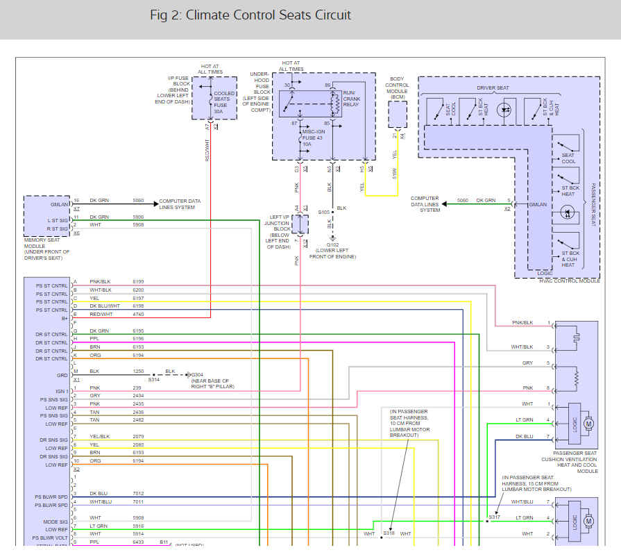 To go through the circuit and test what might be wrong if visual inspection fails. If you follow the circuits from the hot wire power source you can read it with a multi meter at different point to check for 12 Volts. This is done by checking if 12 volts is available to each part in the circuit and seeing if the 12 volts passes through the part on the other side. You follow the pathof the voltage in series by tracing the path of the vaoltage from fuse box to ground. Some components liek the Memory Control Module and the Heater Switch with the temp sensor in it will not always have a 12 volt signal as there must be certain conditions me to trigger the signal. For instance, the temp sensor must sense that the temp is below whatever setting you chose for the seat and it turns off the volatage when that threshold is broken to keep the seat at the set temp.