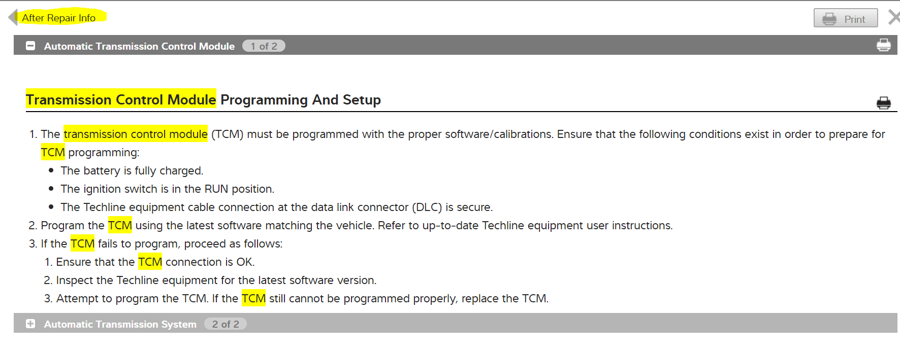 2. Program the TCM using the latest software matching the vehicle. Refer to up-to-date Techline equipment user instructions.