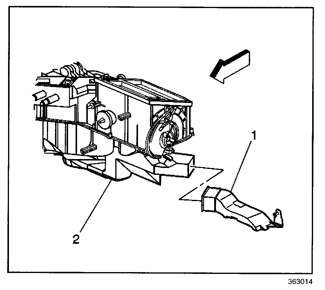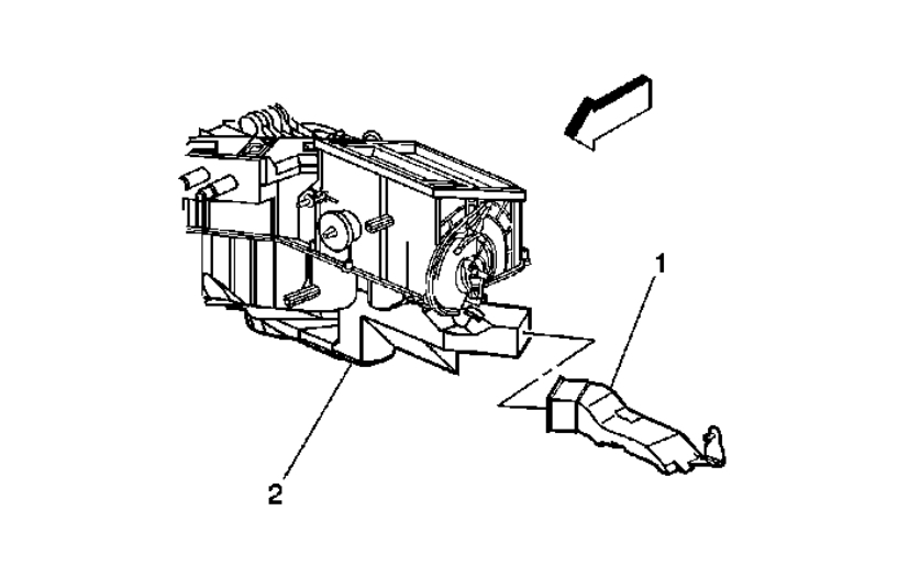 1. Remove the floor air outlet duct extension (1) from the floor duct (2).