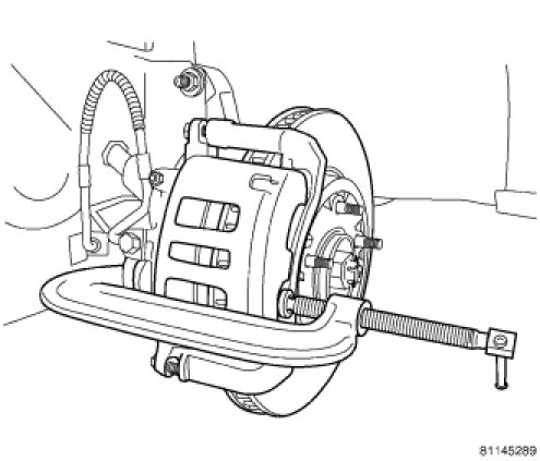8. Remove disc brake caliper from brake adapter and hang out of way using wire or a bungee cord. Use care not to overextend brake hose when doing this.